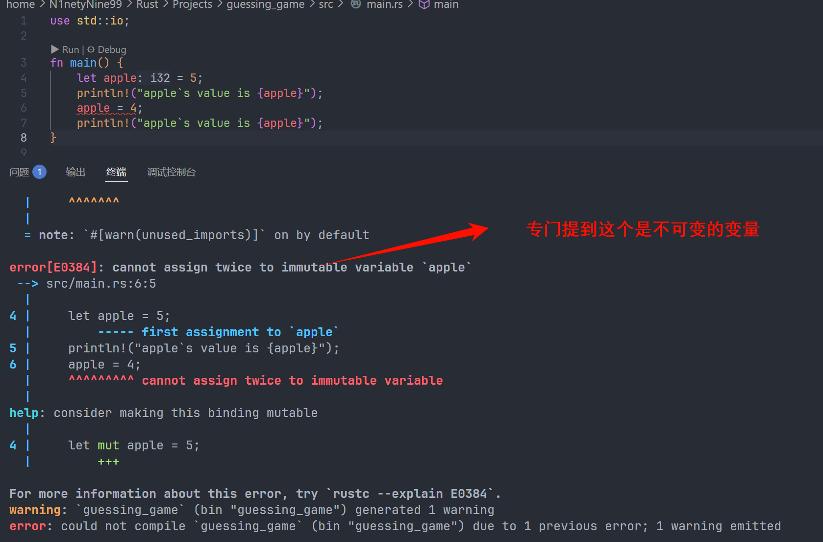 在 Rust 中,let 用来声明一个变量,比如 let apple = 5; 在这个语句中,我们声明了一个变量名为 apple,其值为 5 的一个变量。在 Rust 中,如果不做说明,则默认声明的变量是一个 不可变的(immutable)。意思就是,在我们声明了这个 apple 之后,是没有办法修改其值 5 的,编译器会报错,如下图所示: