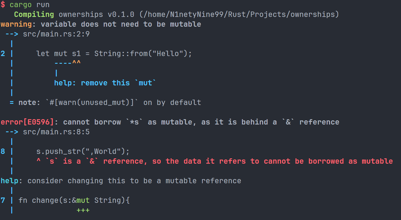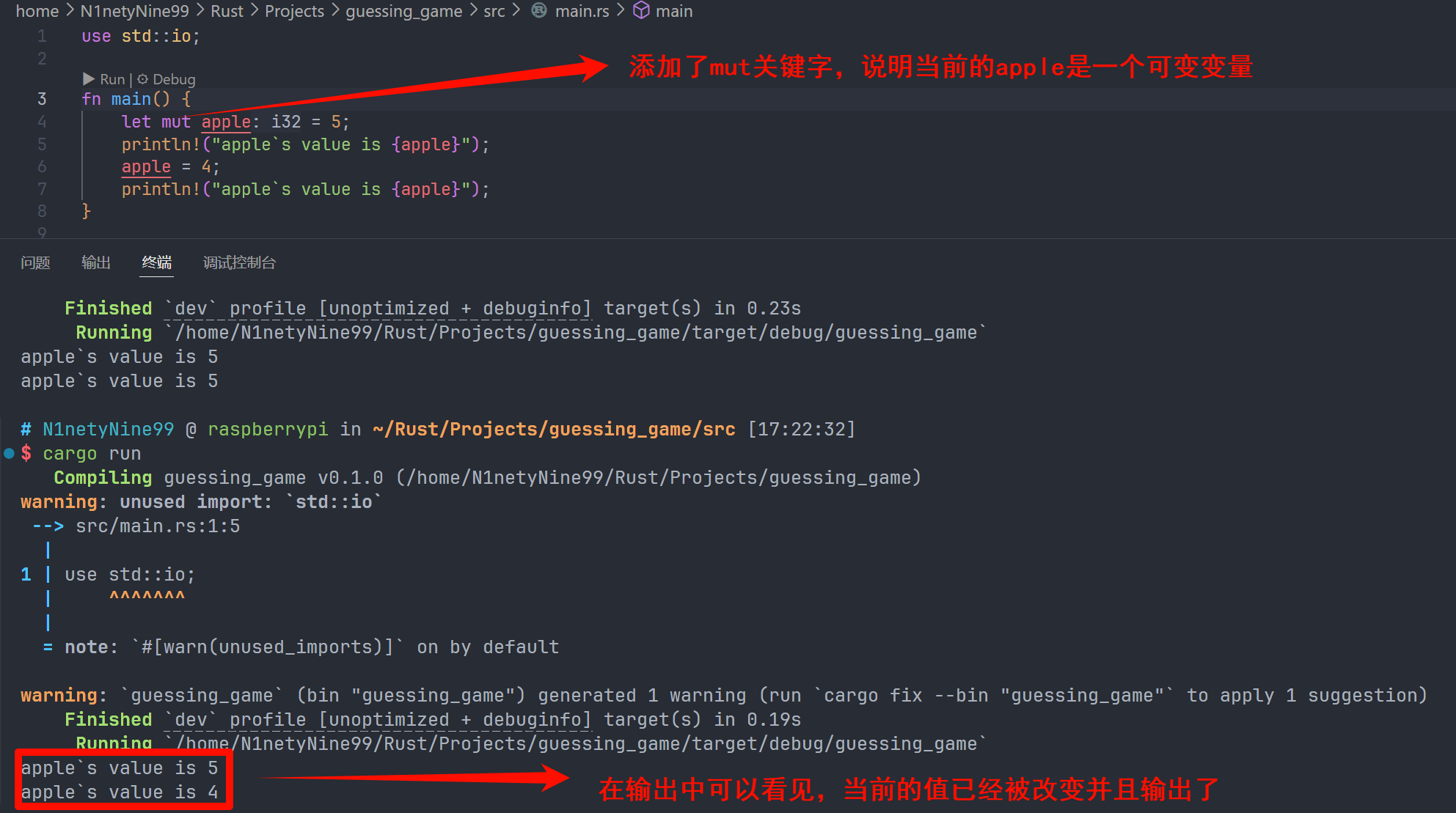 正如之前所提到的,Rust 中的所有的变量默认是不可变的。如果我们想要让这个变量可变,需要使用到关键字 mut 来显式声明这个变量是可变的。