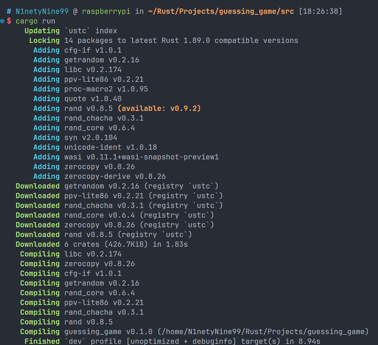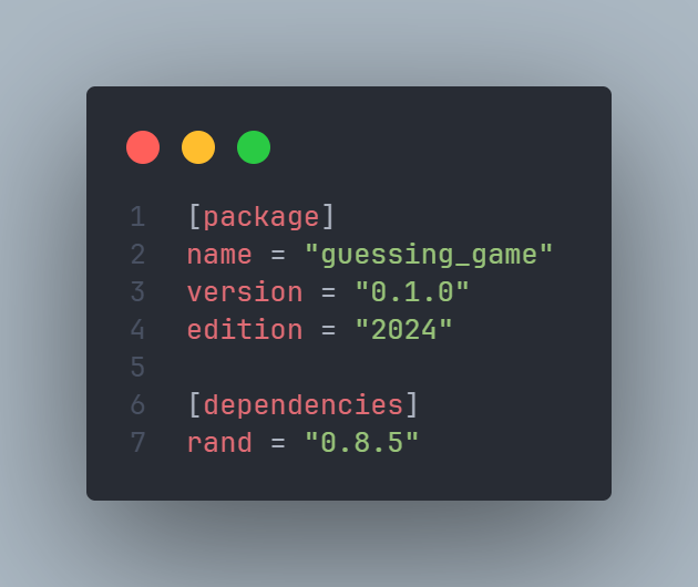 其中格式为 “crate 名 + 版本号”(Rust 中的 crates 可以简单理解为外部库),这里的 0.8.5 是 ^0.8.5 的简写,意味着任何低于 0.9 但是高于等于 0.8.5 的版本。