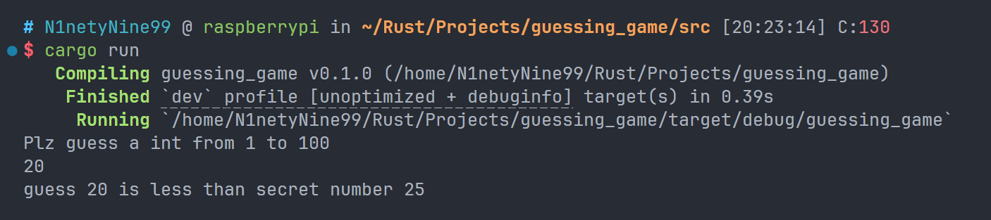 如上更新了代码,我们先是引用了 rand 库的 Rng 模块,里面定义了生成随机数的方法,之后使用不可变的变量获得了一个 1~100 的随机数。rand::thread_rng 是一个仅限于当前执行线程且由操作系统初始化的生成器,加上后文的 gen_range 就可以产生一个随机数,其中 gen_range 的入参是一个 范围表达式,用来指定生成随机数的范围。