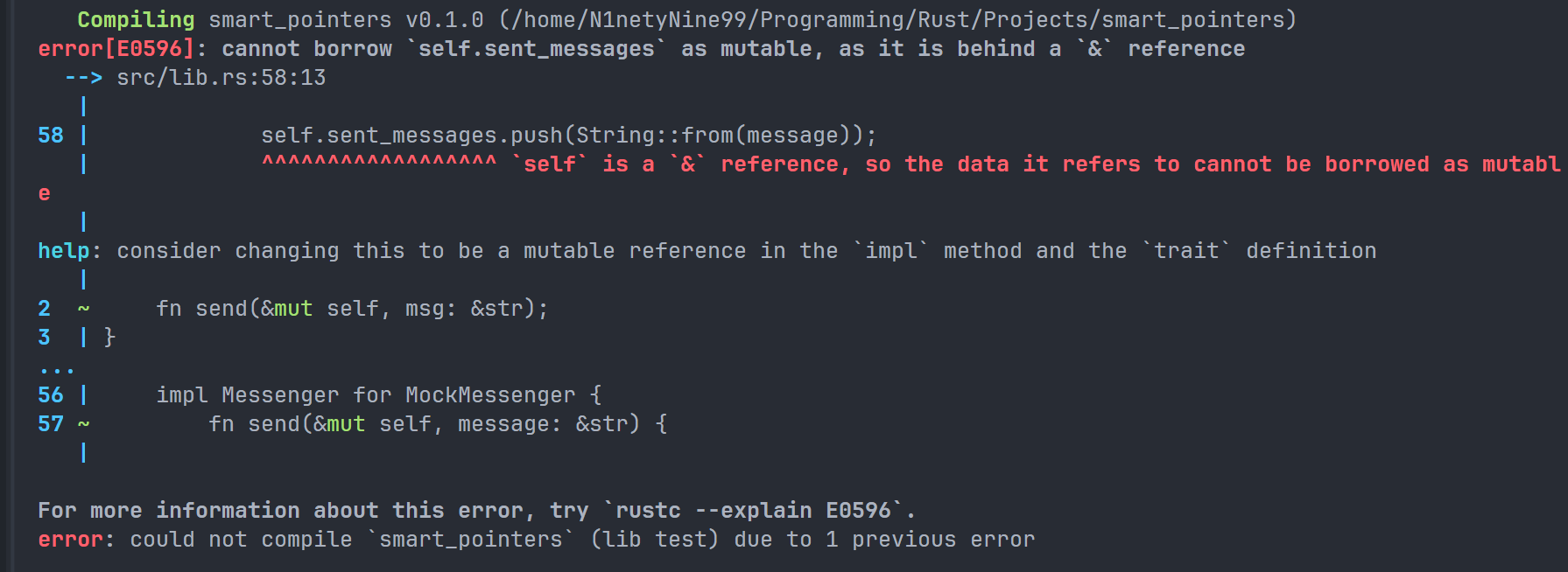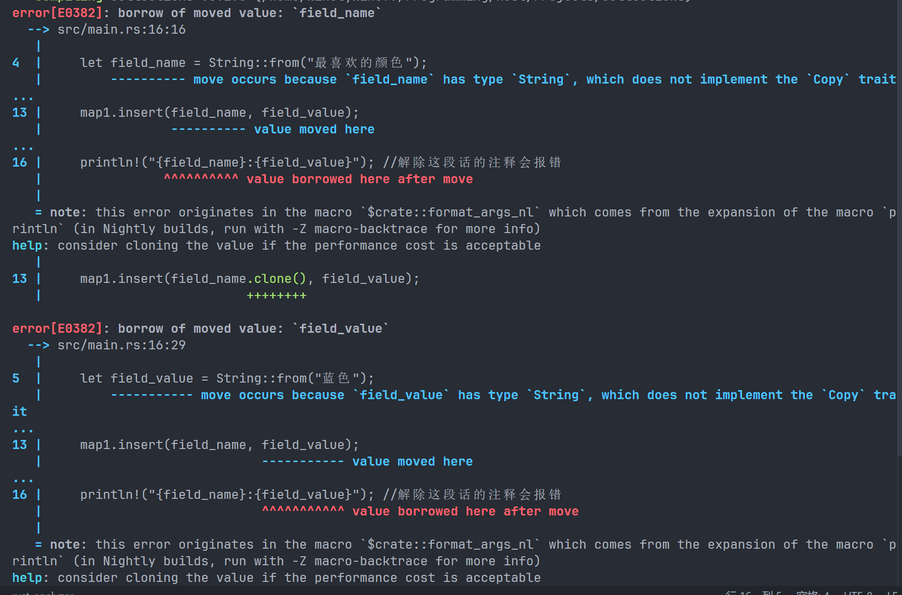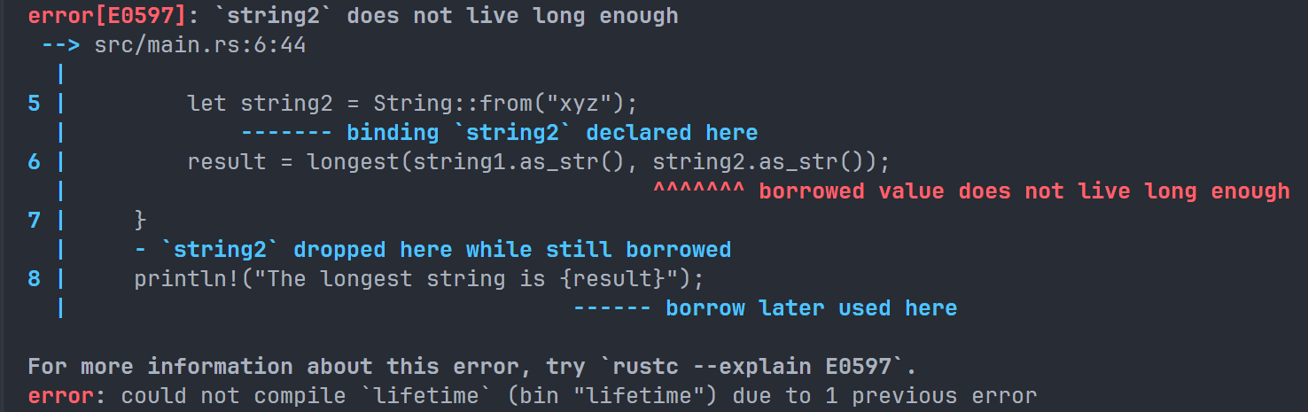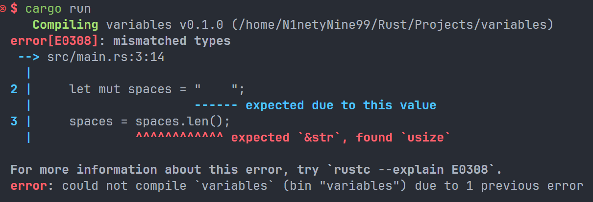 这是因为我们在第一行已经声明了 space 变量为一个字符串,而 len() 方法返回值是当前字符串的长度,是一个整数。我们尝试把一个整数赋值给一个字符串,这是 Rust 不允许的,所以报错了。正确做法应该是和上文一样使用两次 let。