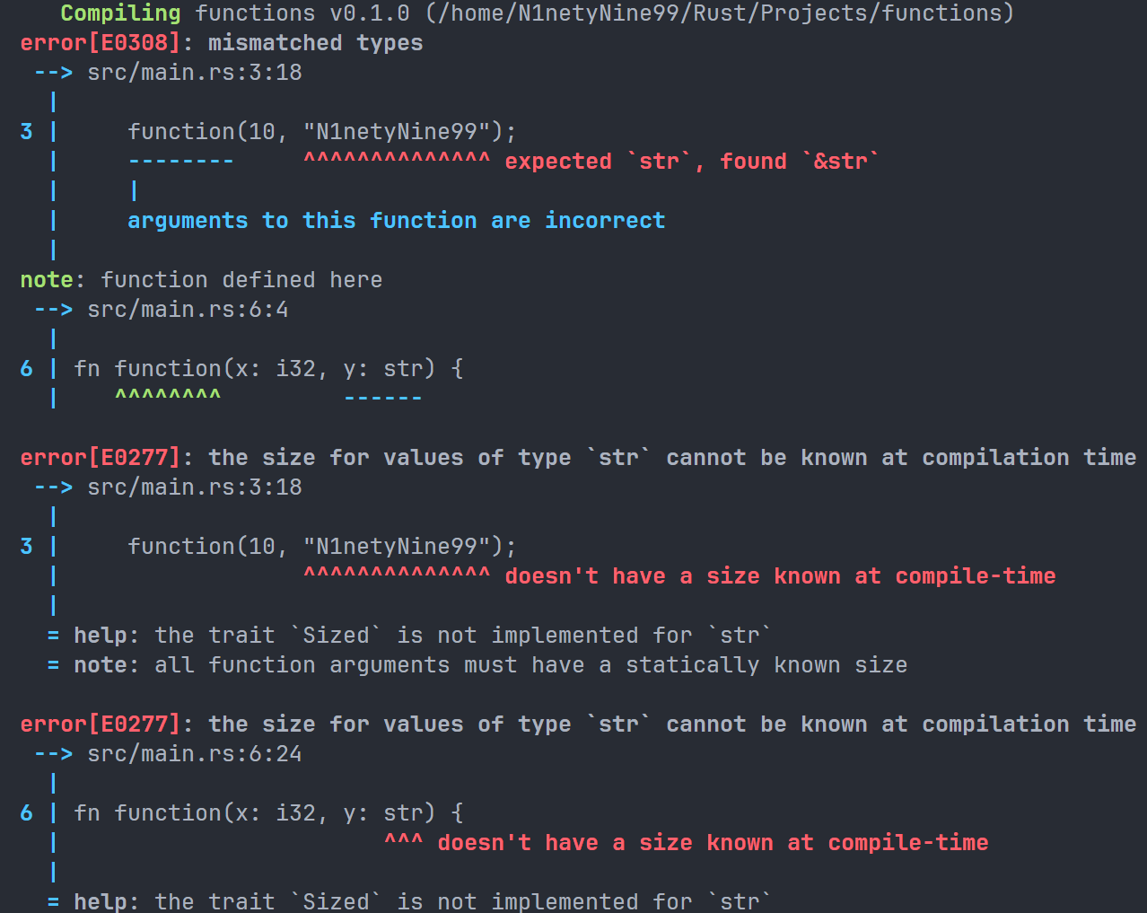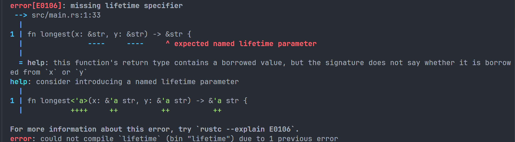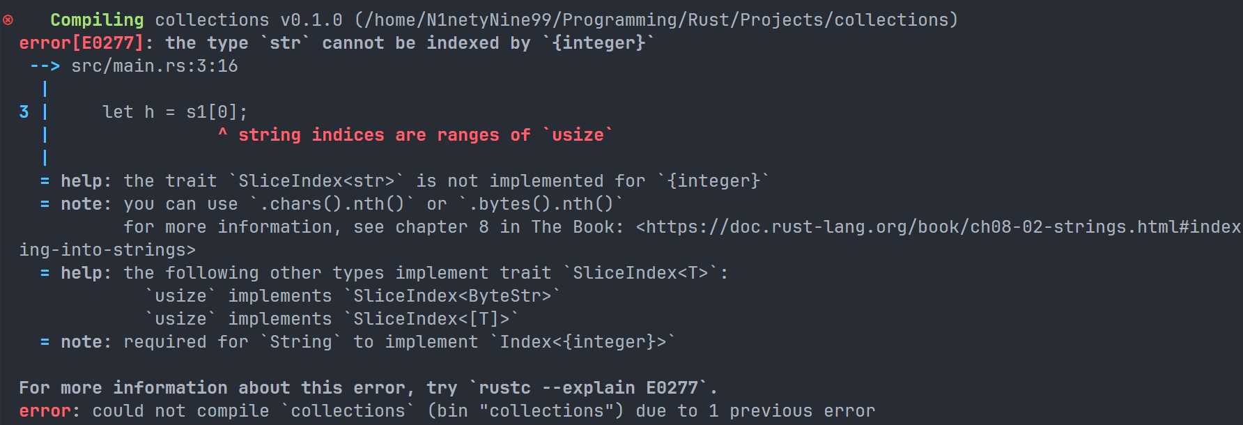 这是因为我们在第一行已经声明了 space 变量为一个字符串,而 len() 方法返回值是当前字符串的长度,是一个整数。我们尝试把一个整数赋值给一个字符串,这是 Rust 不允许的,所以报错了。正确做法应该是和上文一样使用两次 let。