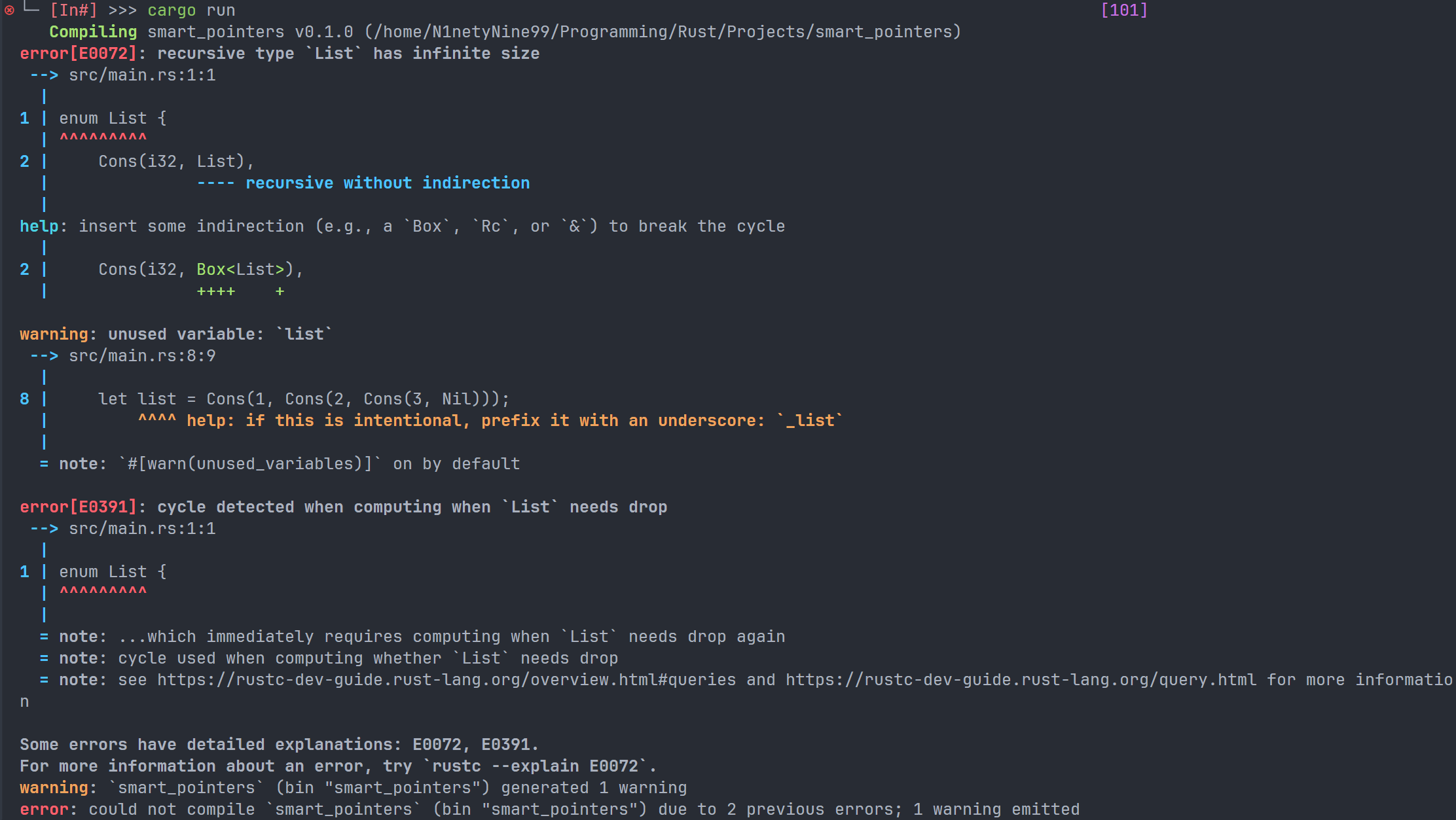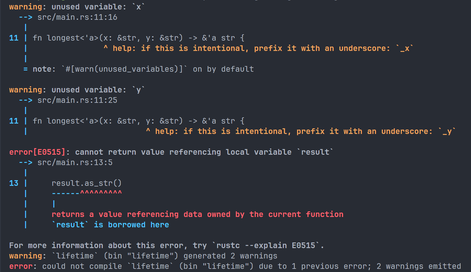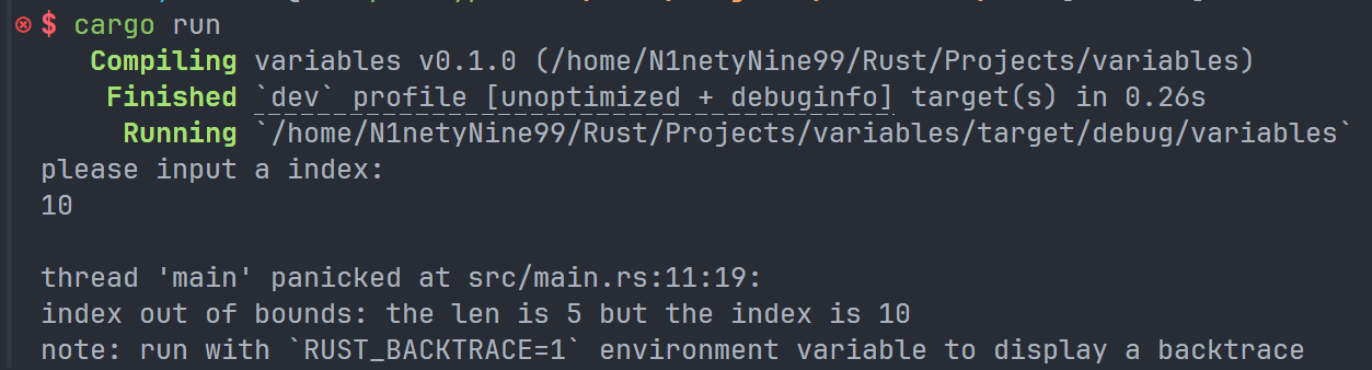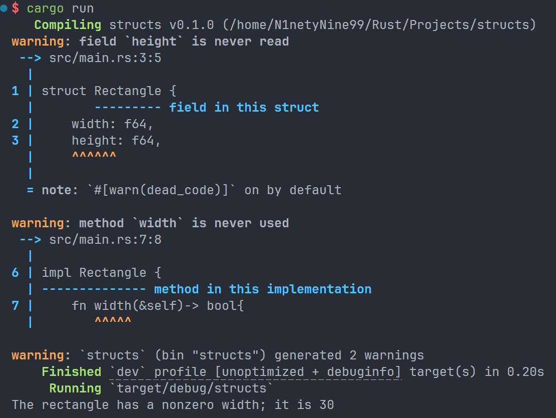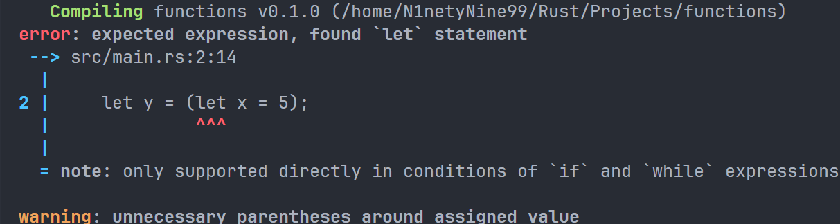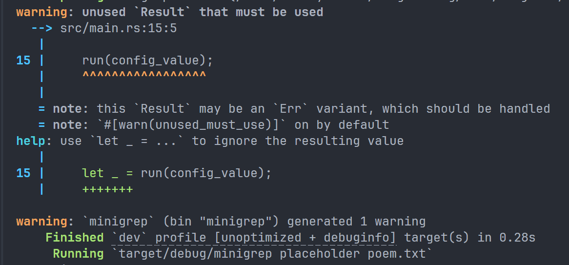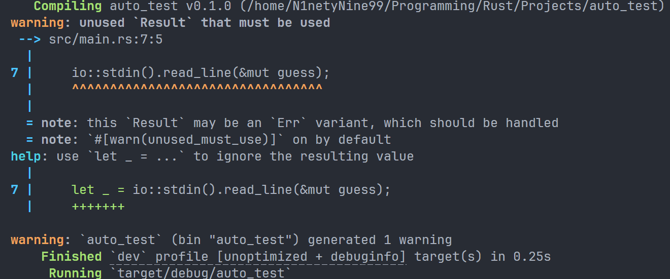 Result 的值有两种,分别是 Err 和 Ok,前者表示语句执行出现错误,并且会包含一些调试信息,后者表示顺利执行。而 except 是 Result 类型的一种方法,如果 Result 的返回值为 Err,那么 except 就会终止程序,并且在终端中显示我们传入进去的字符串。如果 Result 的返回值是 Ok,在本条语句中,返回值将是用户输入的字节数目。如果不添加 except,项目依旧可以正常编译,但是编译器会向我们发送警告:
