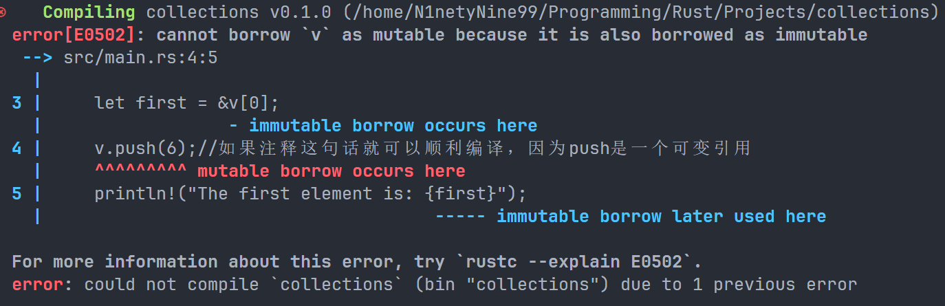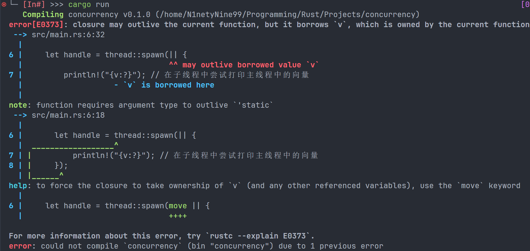 这个闭包使用了v,所以它会捕获v并将其作为闭包环境的一部分。由于thread::spawn会在新线程中运行这个闭包,我们应该能够在那个新线程中访问v。但是当我们编译这个示例时,会得到以下错误: