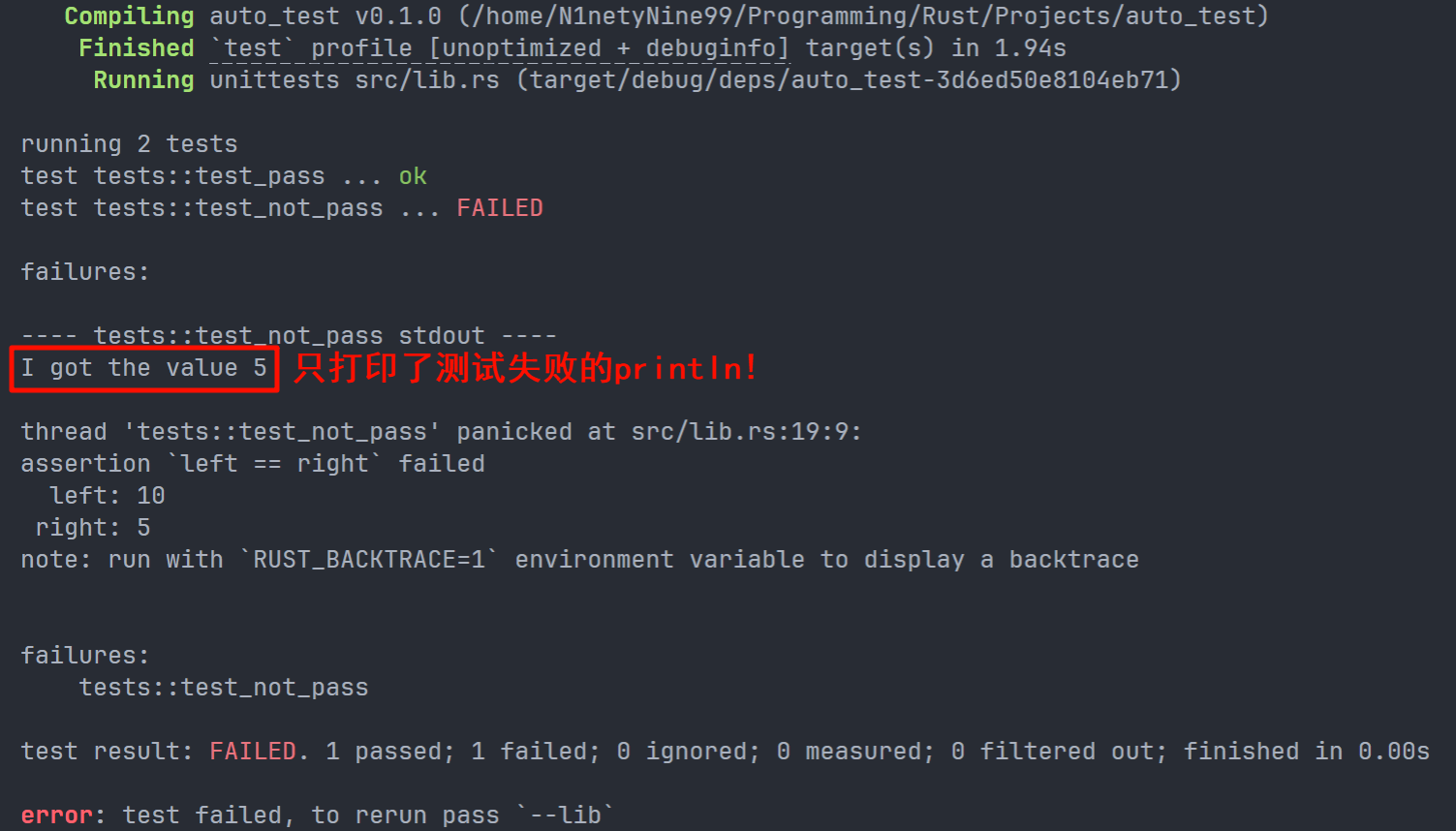 作为一个输出语句,Rust 标准的输出语句是 println,没有 !, 这个感叹号的意思是这是一个 宏(marco),而非一个函数。而 println! 的标准占位符是 {},具体用法后文再提。