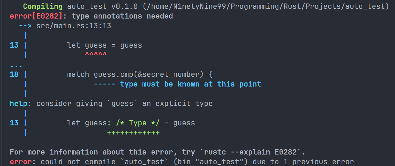 报错的主要问题是 类型不匹配(mismatch)。Rust 作为一个强静态类型语言,具有一个 数据类型推测功能。我们的 guess,在最开始声明的时候就是 String 字符串类型,但是我们生成的随机数,由于我们没有显式的指定类型,编译器会自己猜测数据类型,通常会猜测是一个 整型(integer),Rust 的几种数值类型中,有些可以在 1 到 100 之间取值: i32 (32 位数值)、 u32 (无符号 32 位数值)、 i64 (64 位数值),以及其他类型。除非另有指定,Rust 默认使用 i32 类型。我们想要把一个字符串与整型比较,这显然是不符合常理的,所以编译器才会报错,说 expected &String, found &{integer}, 预期输入的是一个字符串,但是却发现输入的是一个整型。