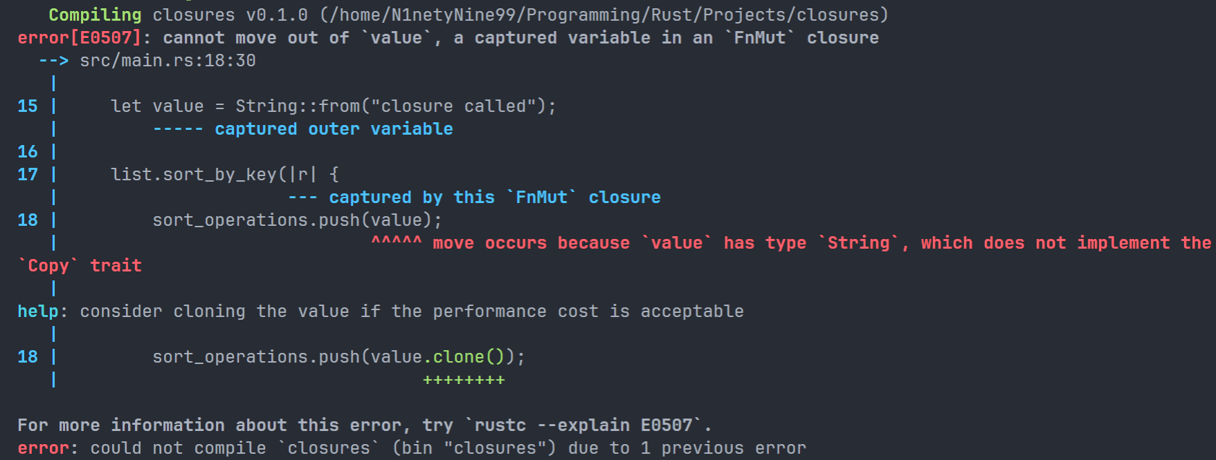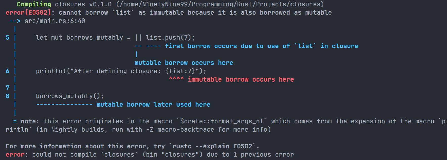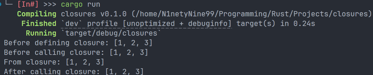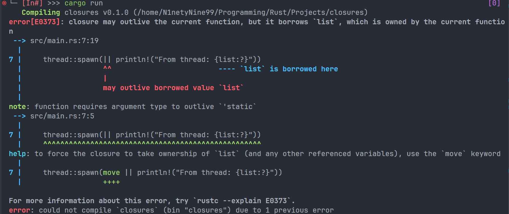 为了修复这个问题,我们可以使用move关键字,放置于闭包的前面;这样,我们会让闭包强行将捕获的值的所有权占为己有,而不是让编译器去推断: