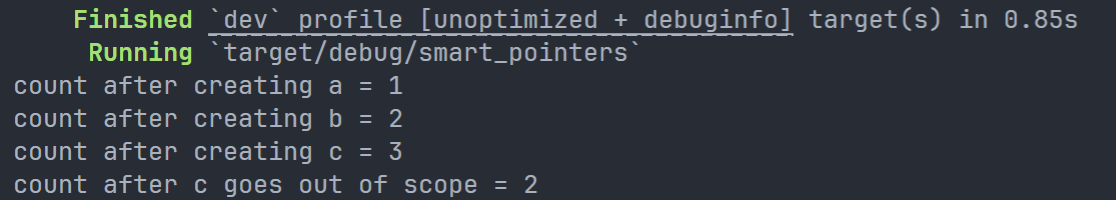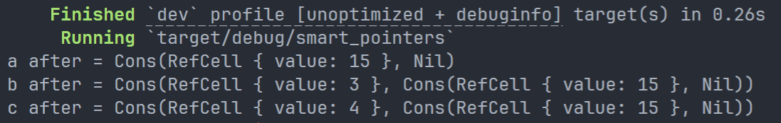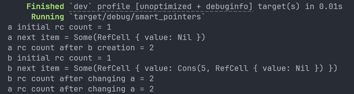 我们添加了一个main函数,这段代码在a中创建了一个列表,并在b中创建了一个指向a中列表的列表。然后,它修改a中的列表以指向b,从而形成一个引用循环。过程中还穿插了一些println!语句,用于显示该过程中各个节点的引用计数: