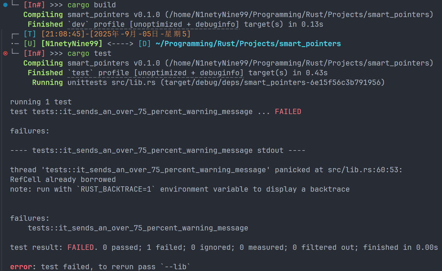 我们对List的枚举中的Cons变体的第二个值定义为RefCell<Rc<List>>,意味着,我们可能会修改Cons变体中指向的List的值。这个tail方法也让我们更加简单的找到下一项。