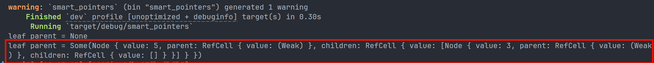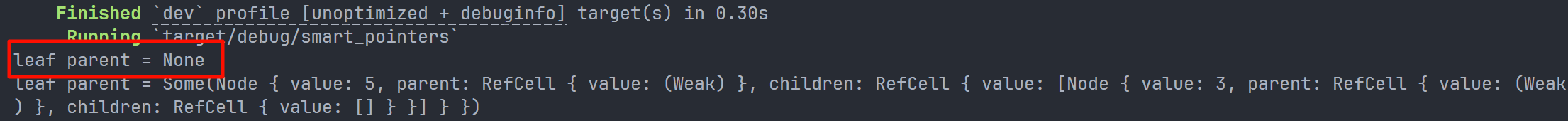 此时,当我们尝试通过使用upgrade方法获取leaf的父节点引用时,得到的是一个None值。我们在第一个println!语句的输出中可以看到这一点: