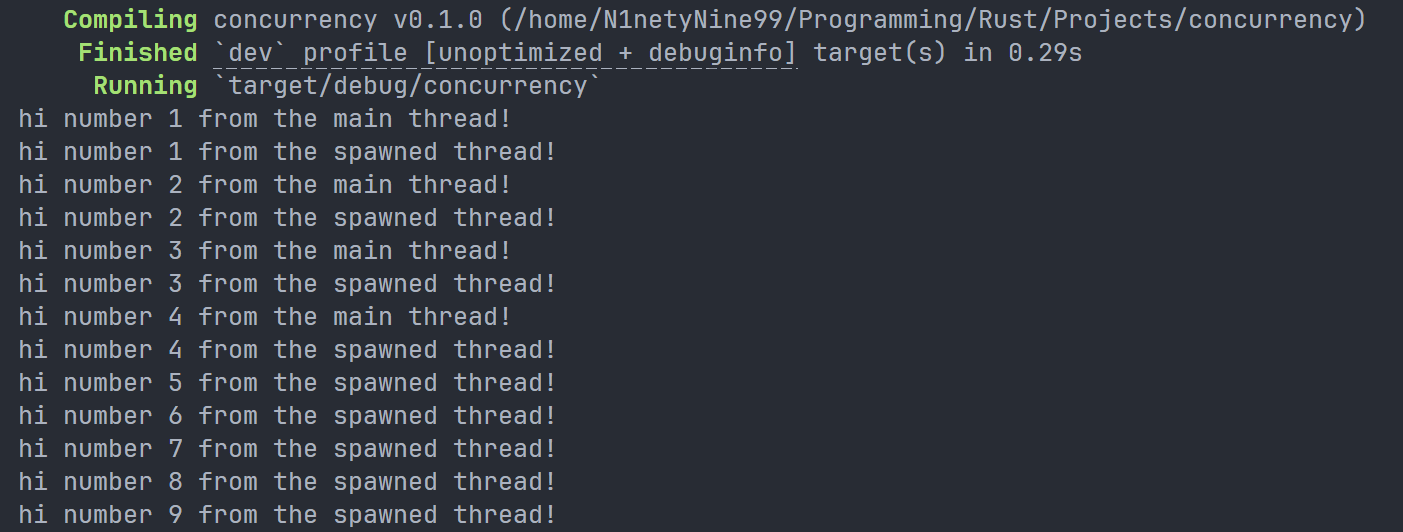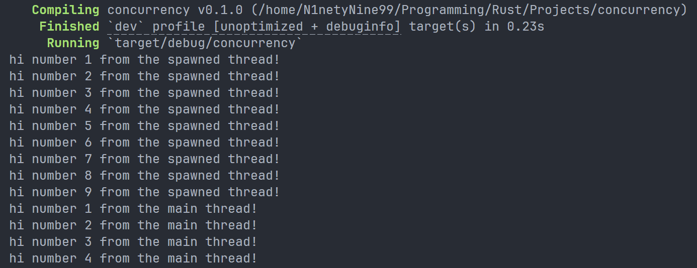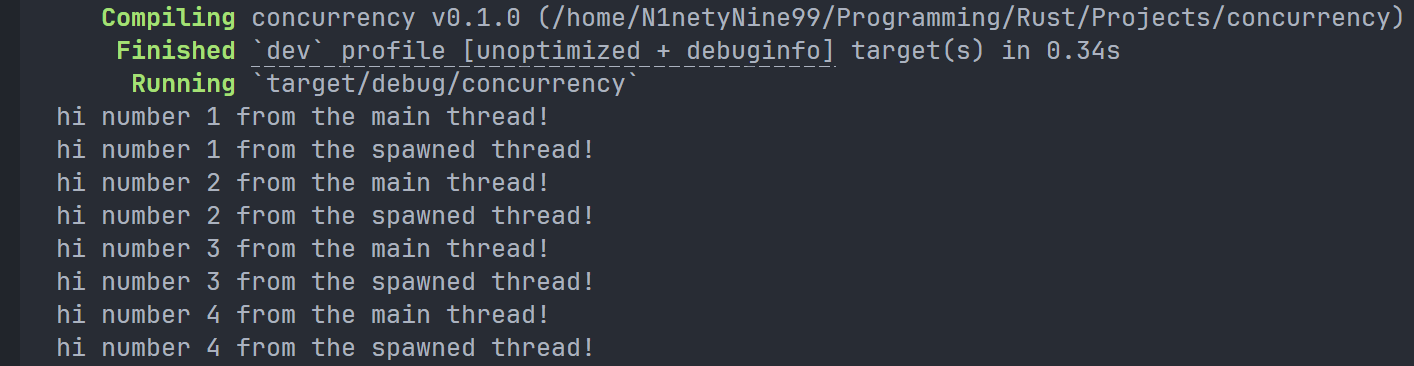 thread::sleep的调用会迫使线程暂停执行一小段时间,让其他线程得以运行。这些线程可能会交替执行,但这并不能保证:这取决于操作系统对线程的调度方式。在本次运行中,主线程先打印了内容,尽管新生成线程的打印语句在代码中出现得更早。而且,虽然我们让新生成的线程打印到i为9,但它只打印到4,主线程就终止了。