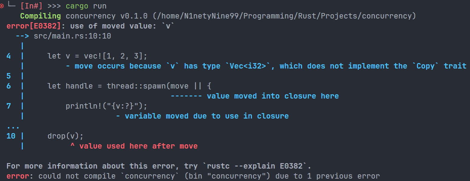 编译器告诉我们,Vec<i32>由于没有实现Copy trait,所以move不能创建一个新的副本,而是直接转交所有权,导致我们不能在主线程中使用一个已经被移动到子线程中的向量!