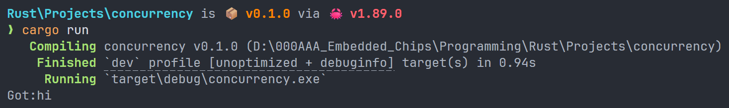 对于接收方,有两种方式接收消息,一种是我们这里的recv()(receive的简写),该方法是阻塞式的,会一直等待接收到了数据才会往后执行,当发送方发送一个值,它会返回一个Result<T,E>的数据类型,当发送方结束了线程还没接收到数据,他就会返回一个错误。